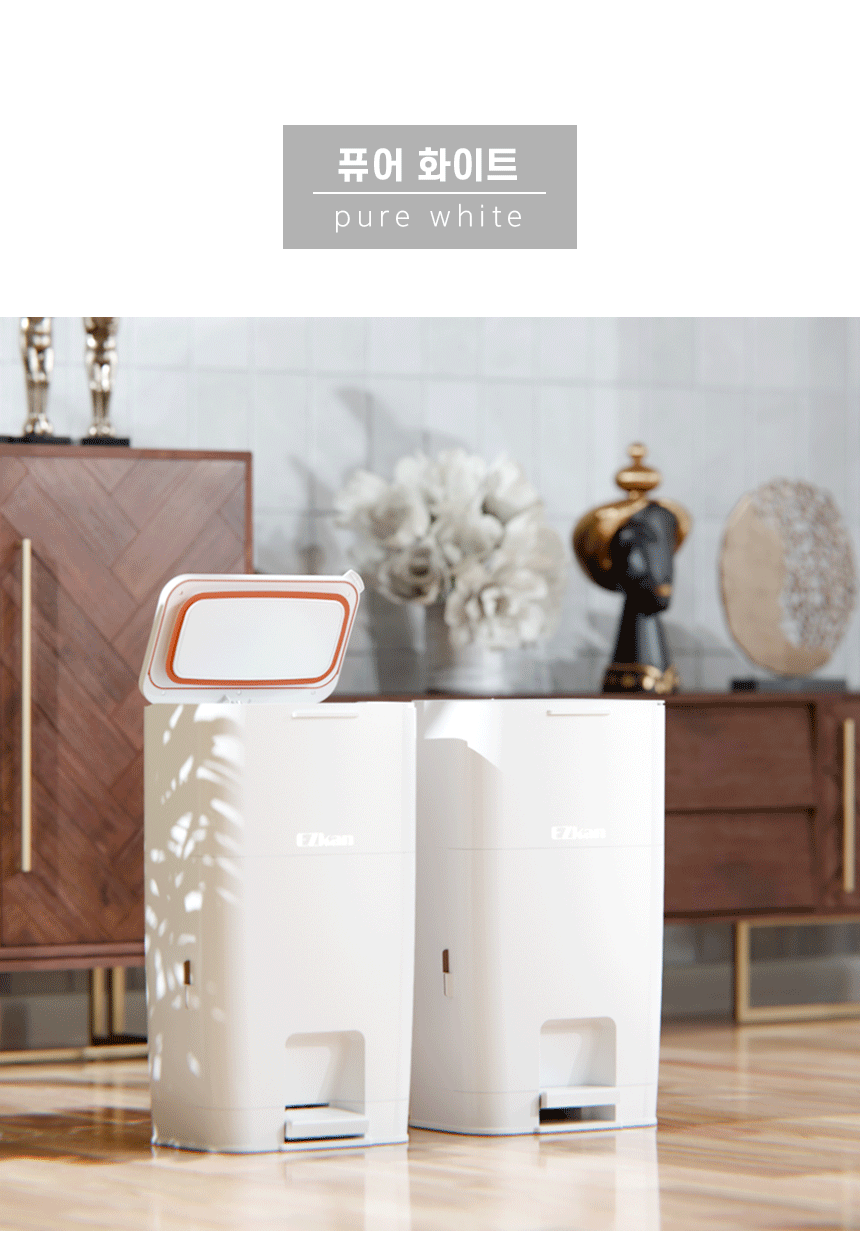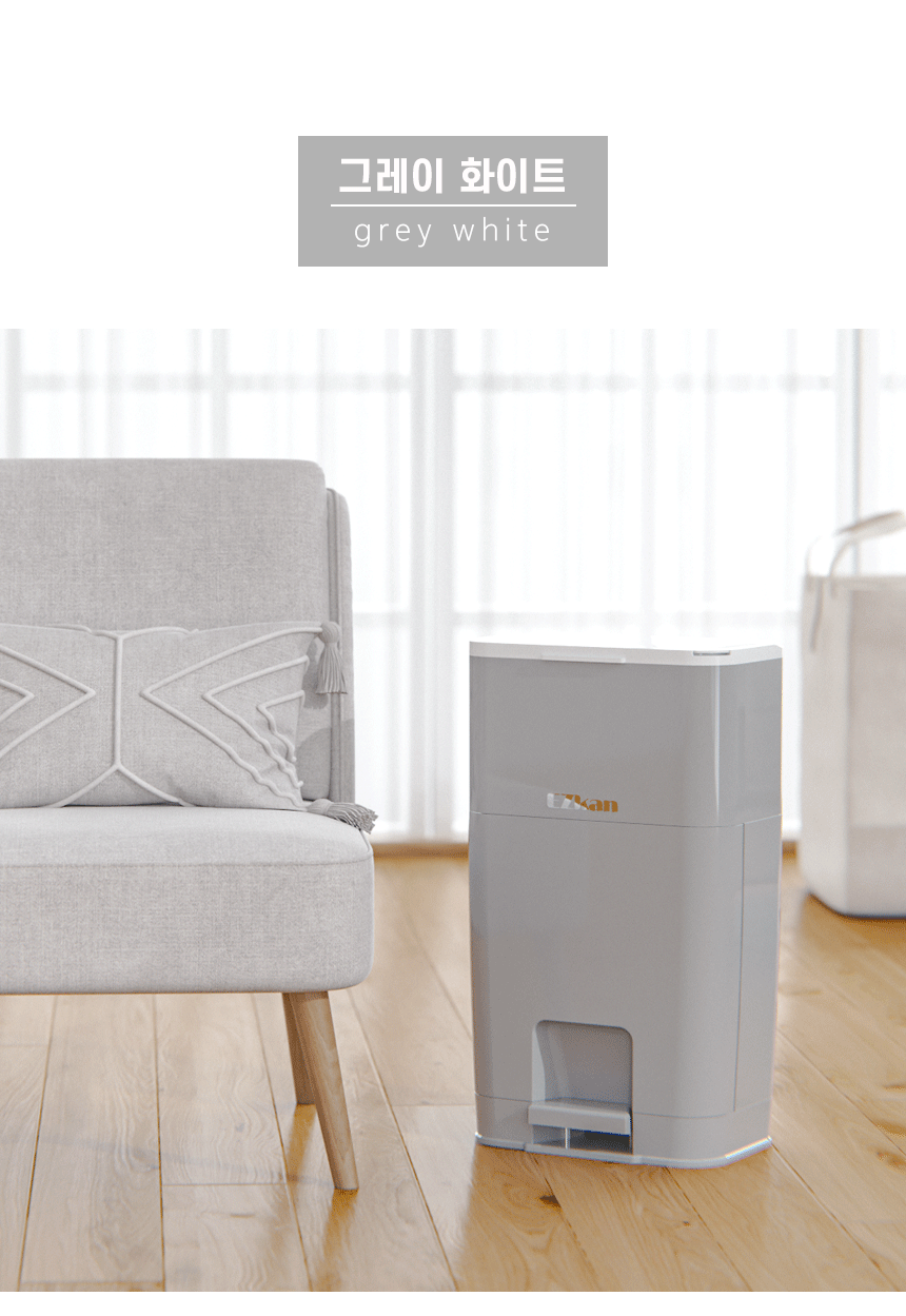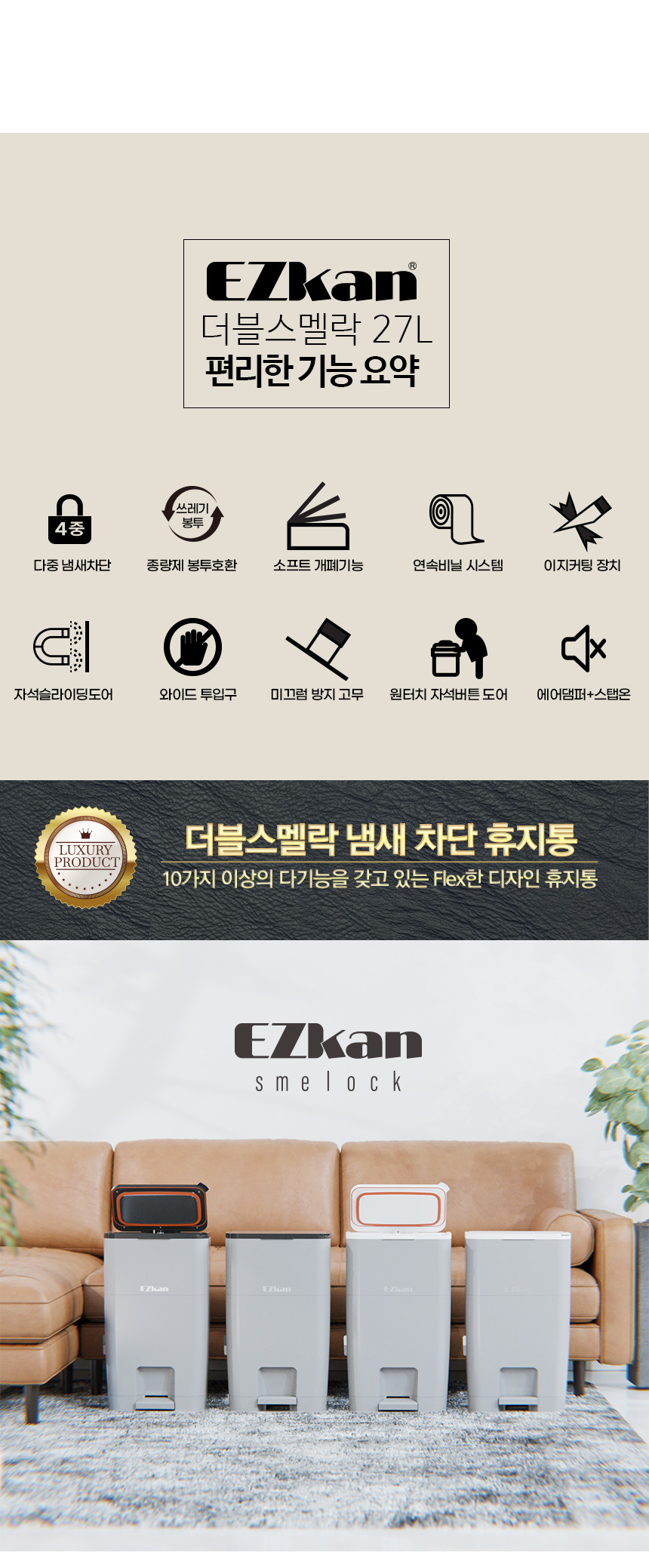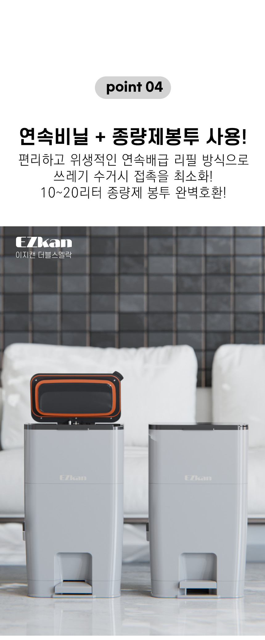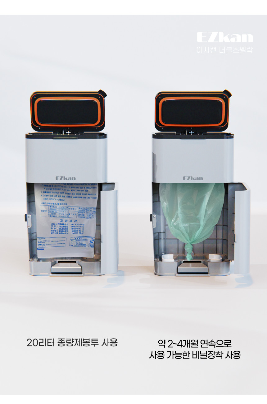 이지캔리필 한번 장착으로 2~3개월 비닐교체 없이 사용 종량제 봉투 10L~ 20L까지 완벽하게 호환 와이드 더블스멜락 구조로 완벽한 냄새 차단