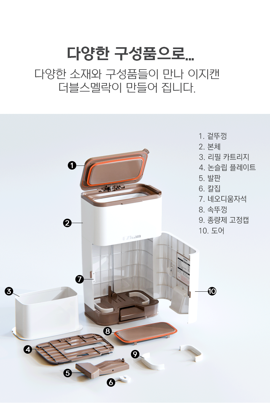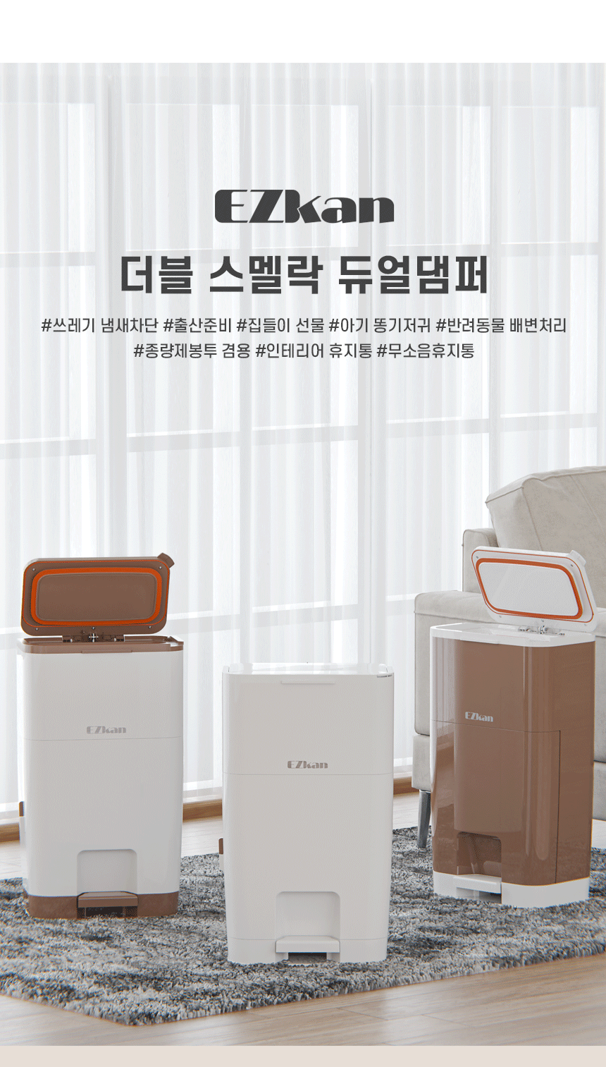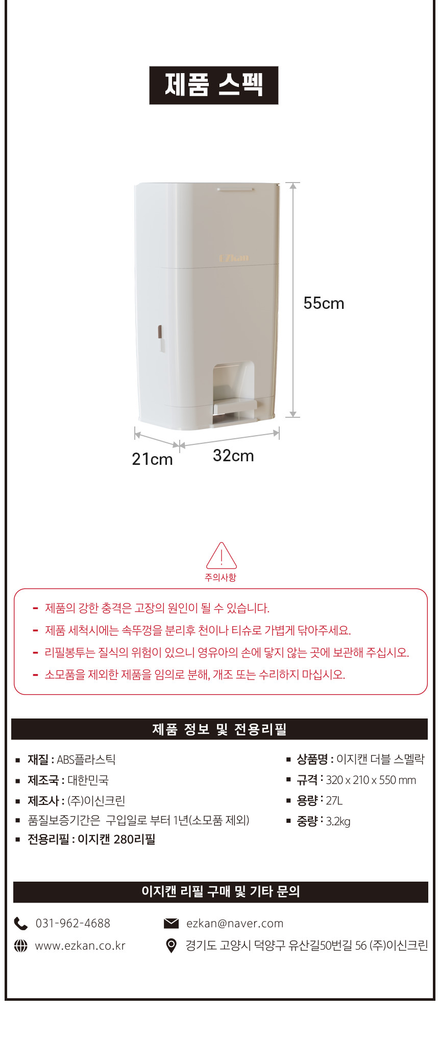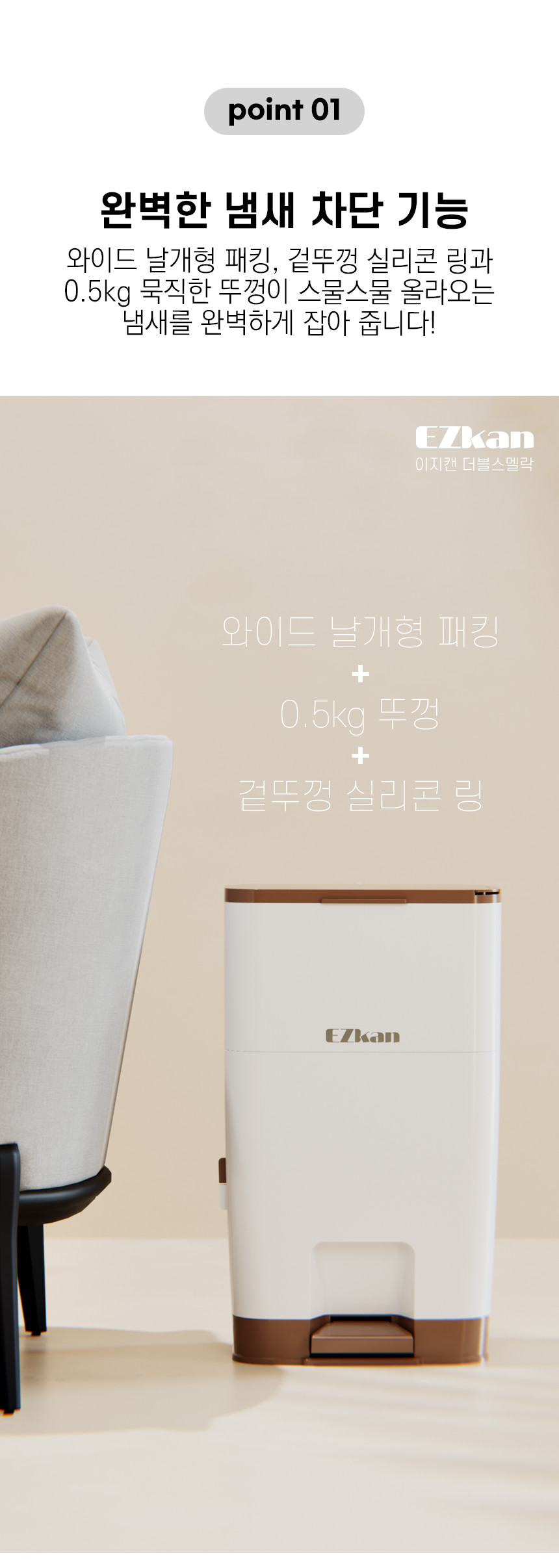 이지캔리필 한번 장착으로 2~3개월 비닐교체 없이 사용 종량제 봉투 10L~ 20L까지 완벽하게 호환 와이드 더블스멜락 구조로 완벽한 냄새 차단