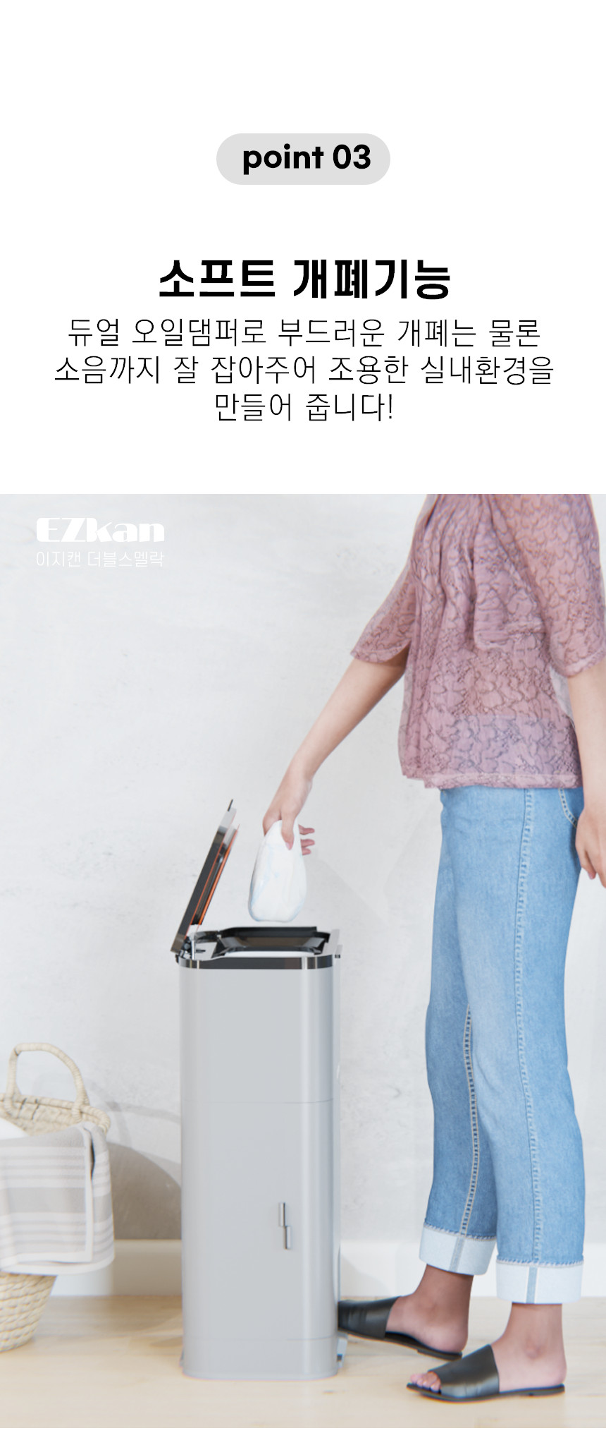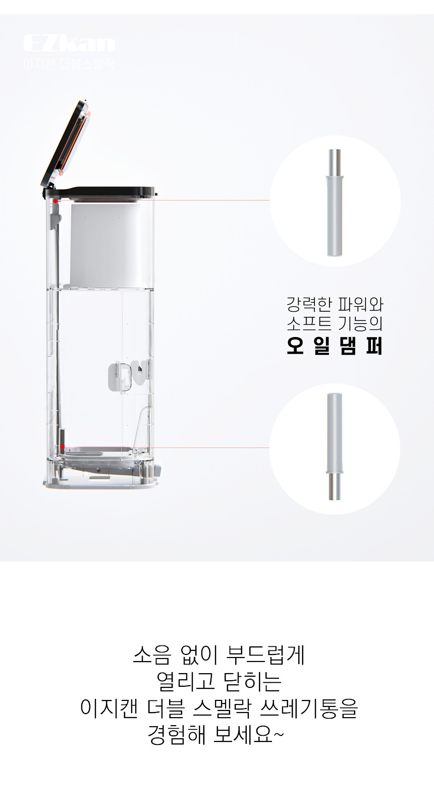 강력한 파워 오일댐퍼가 쓰레기통 본체 위쪽과 아래 부분에 듀얼로 장착되어 있어 소음을 최소화 시켜줍니다.