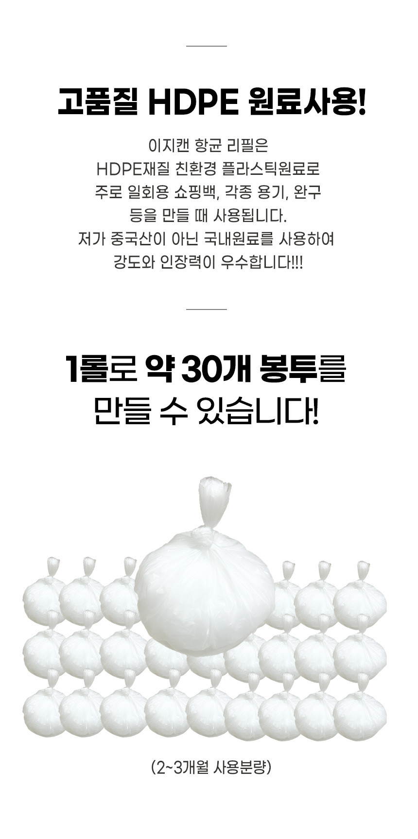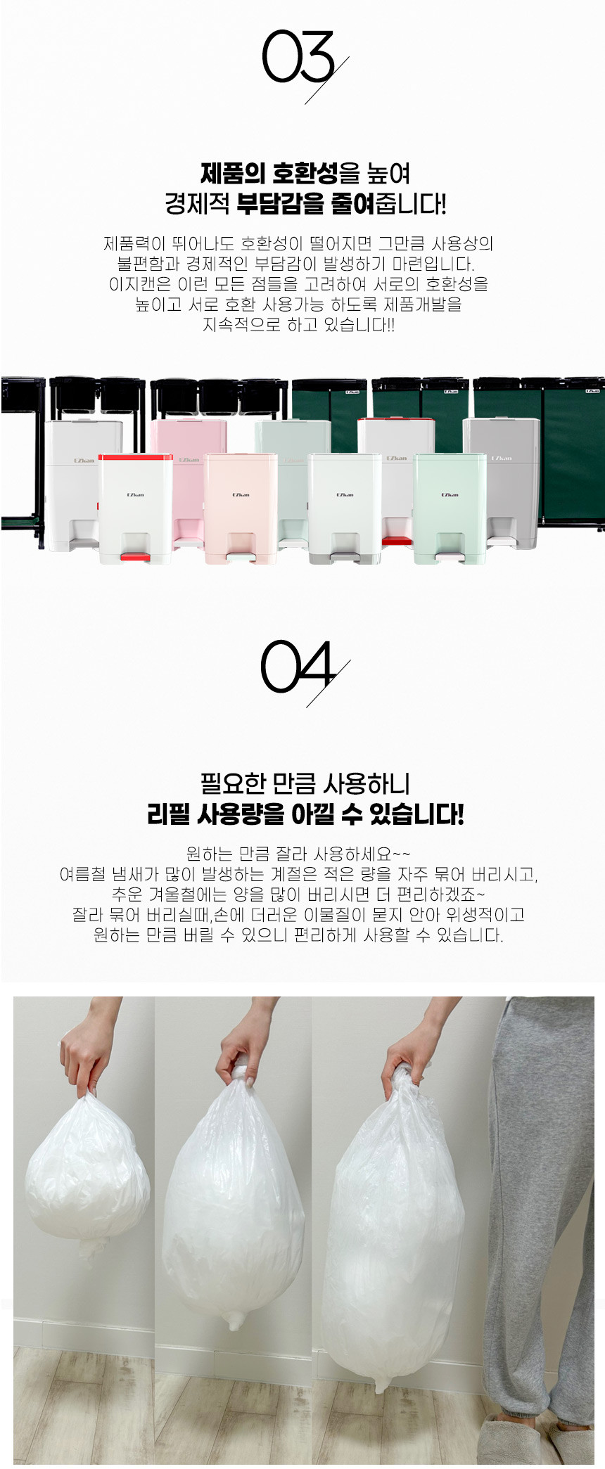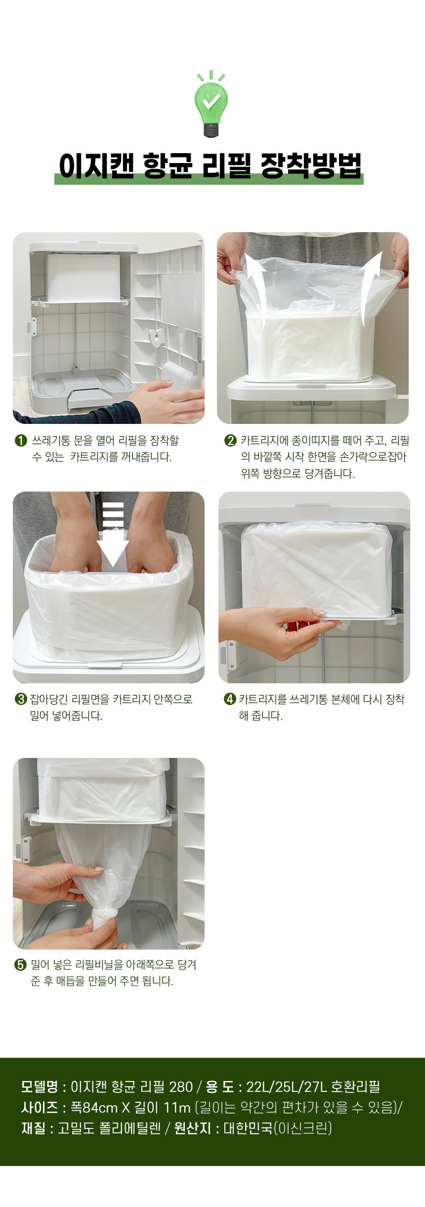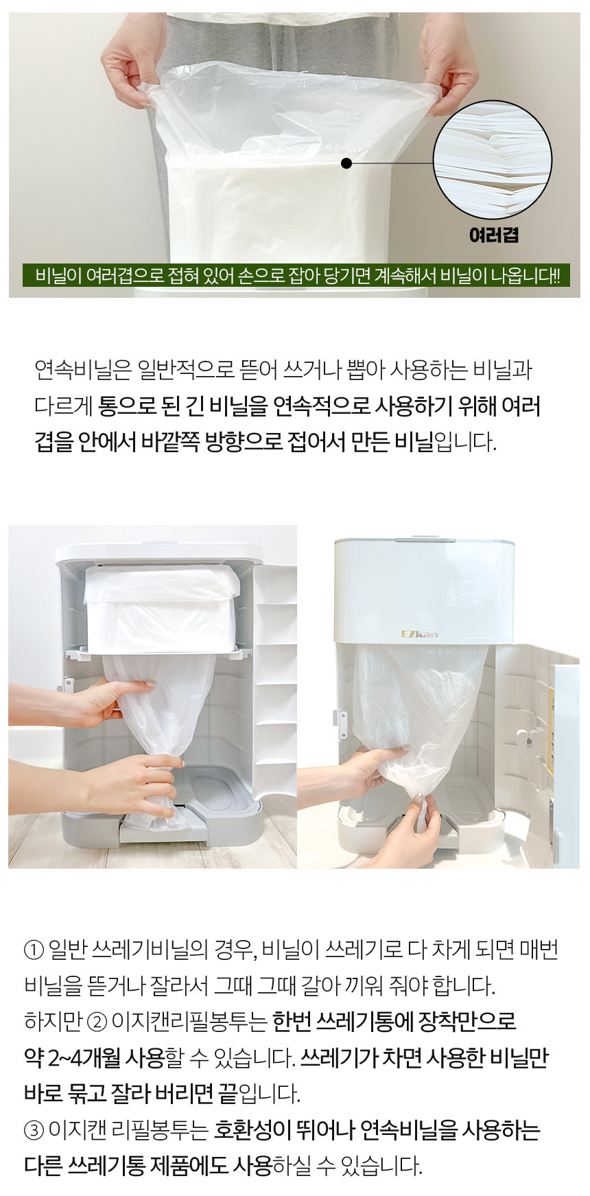 이지캔리필은 한번 장착만으로도 약 2~3달 사용할 수 있고 연속비닐 방식이라 내가 원할 때 쓰레기봉투를 묶어 버리시면 되서 매우 편리하고 위생적이고 경제적입니다.