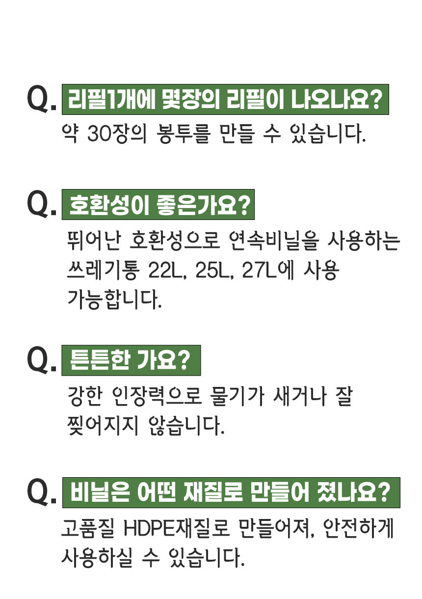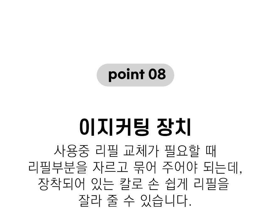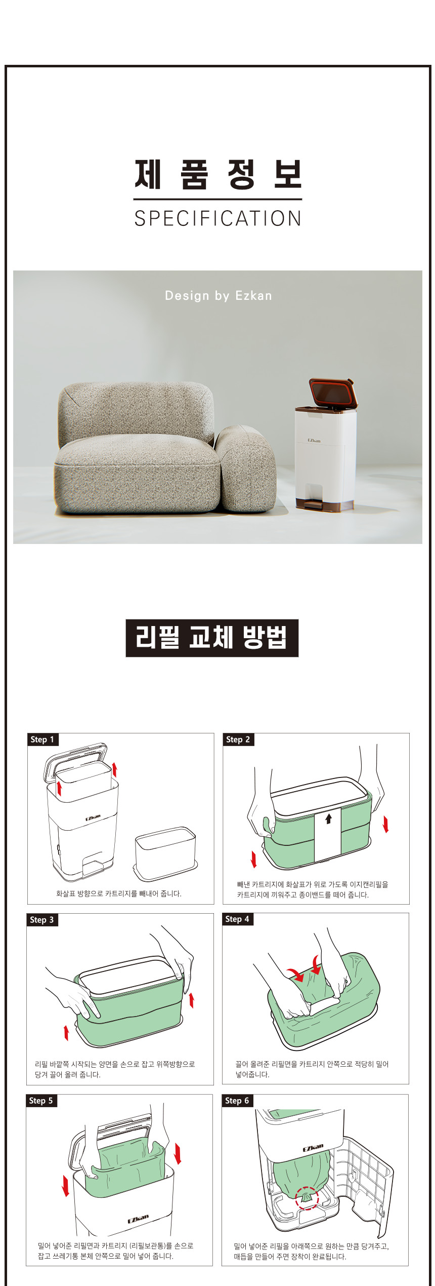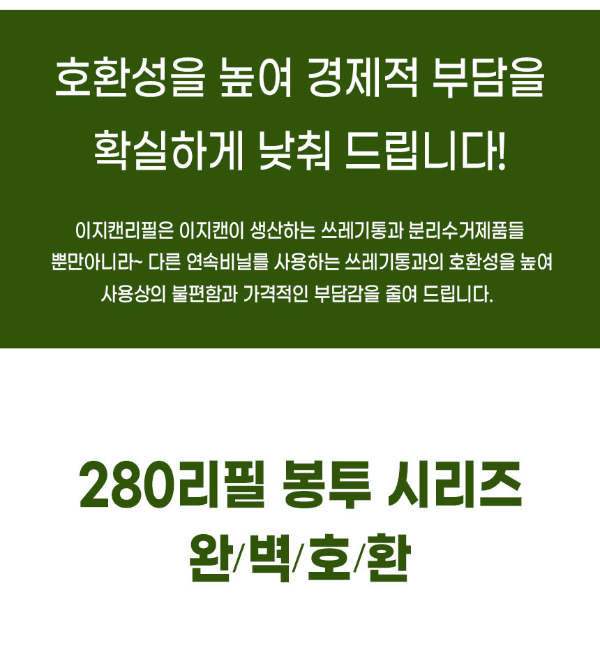 이지캔리필은 한번 장착만으로도 약 2~3달 사용할 수 있고 연속비닐 방식이라 내가 원할 때 쓰레기봉투를 묶어 버리시면 되서 매우 편리하고 위생적이고 경제적입니다.