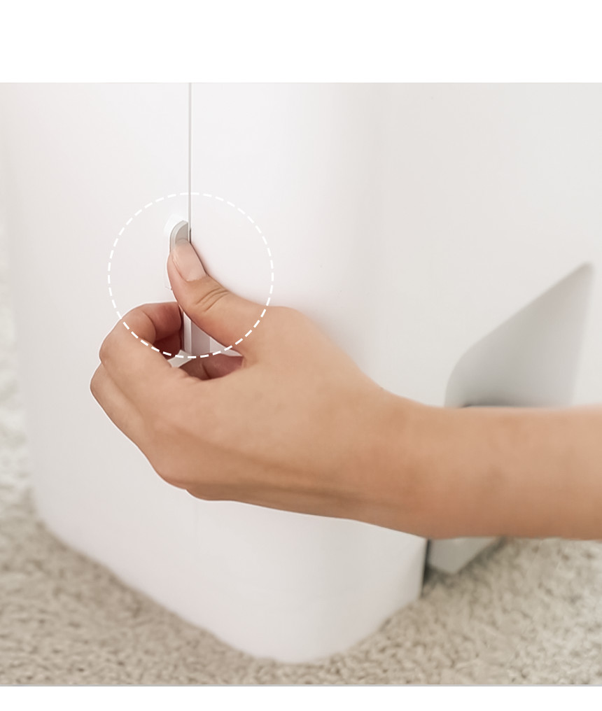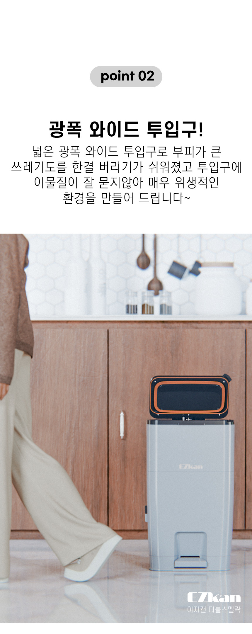 와이드 투입구는 부피가 큰 쓰레기를 버릴때나 더러운 쓰레기를 버릴때, 이물질이 손에 묻을 염려가 없어 매우 위생적입니다.